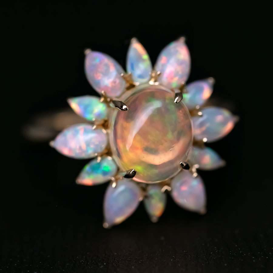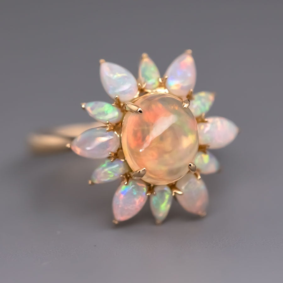 Unique Halo Design Mexican Fire Opal & Australian Opal Engagement Ring 18K Yellow Gold