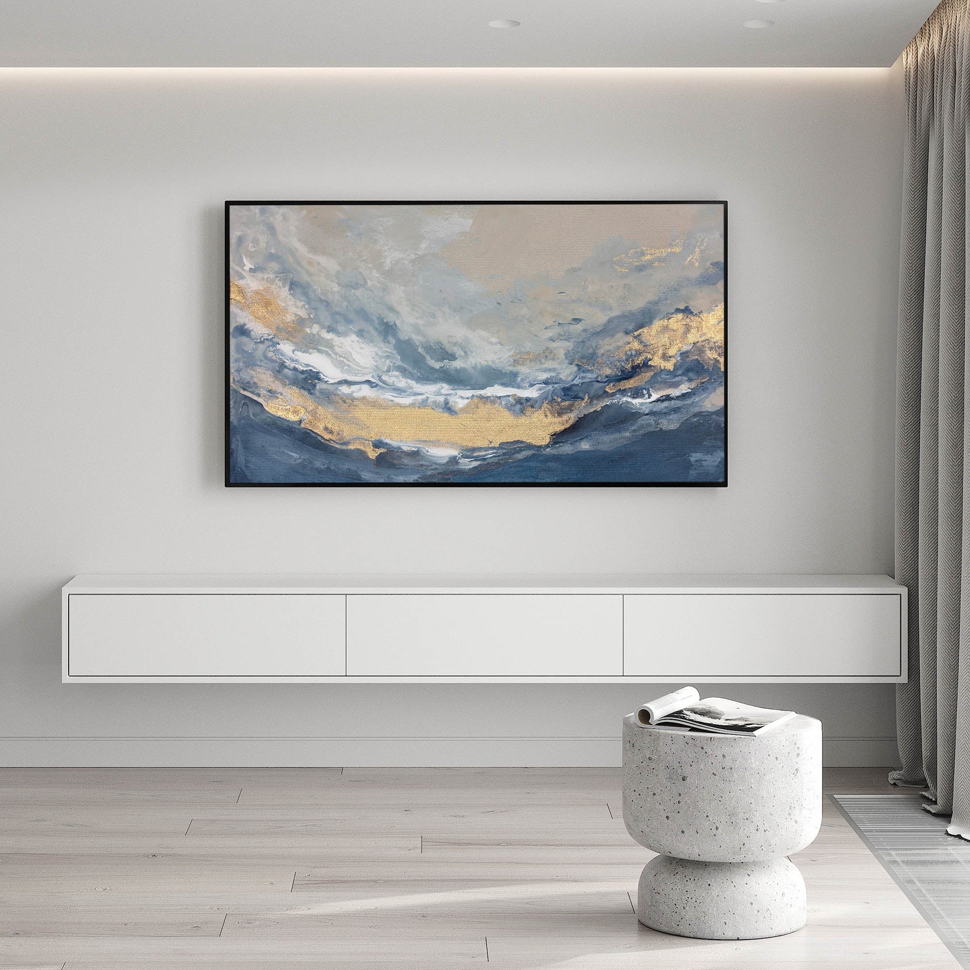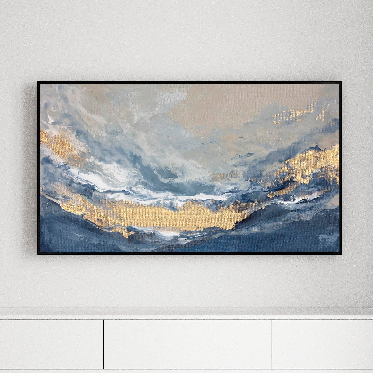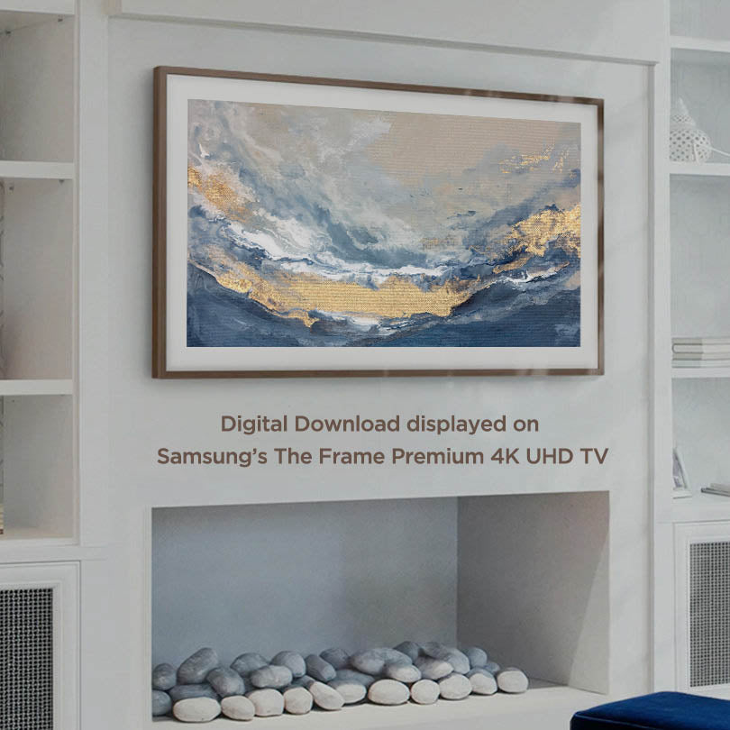 Immerse yourself in the quiet majesty of the coast with artwork that channels the expansive beauty of sea and sky. Soft layers of misty blue, sand-washed beige, and luminous gold seem to ebb and flow across the composition, evoking the peaceful rhythm of the shoreline.