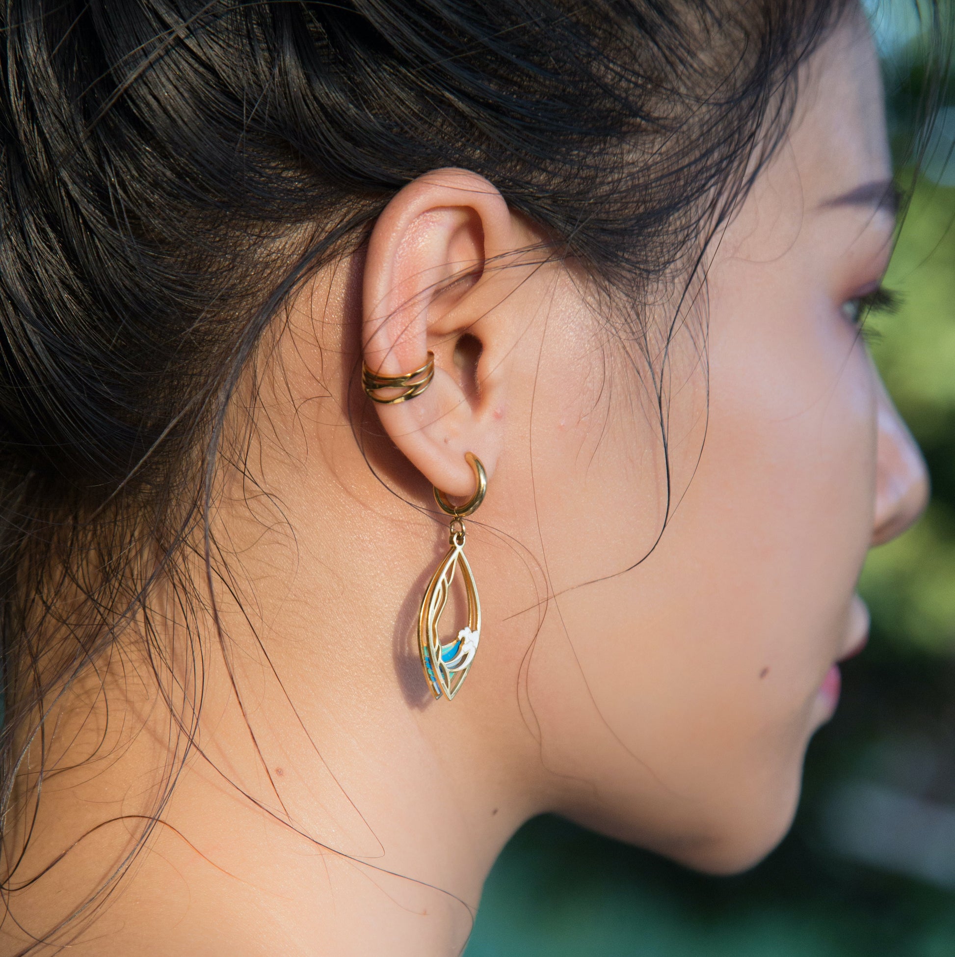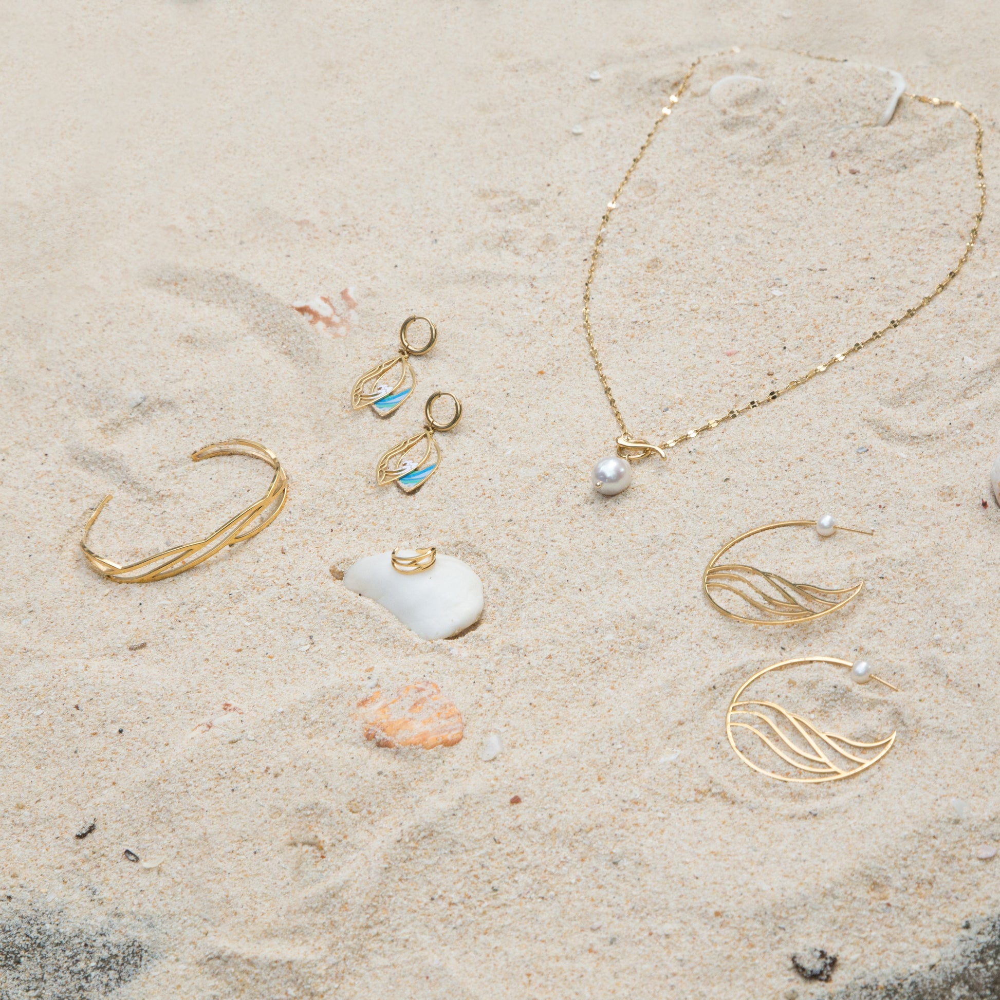 18K gold-plated stainless steel 1.1" pendants with 1.1" blue and white wave enamel pendants on 0.5" 18K gold-plated stainless steel hinged huggie hoops. #E323G.