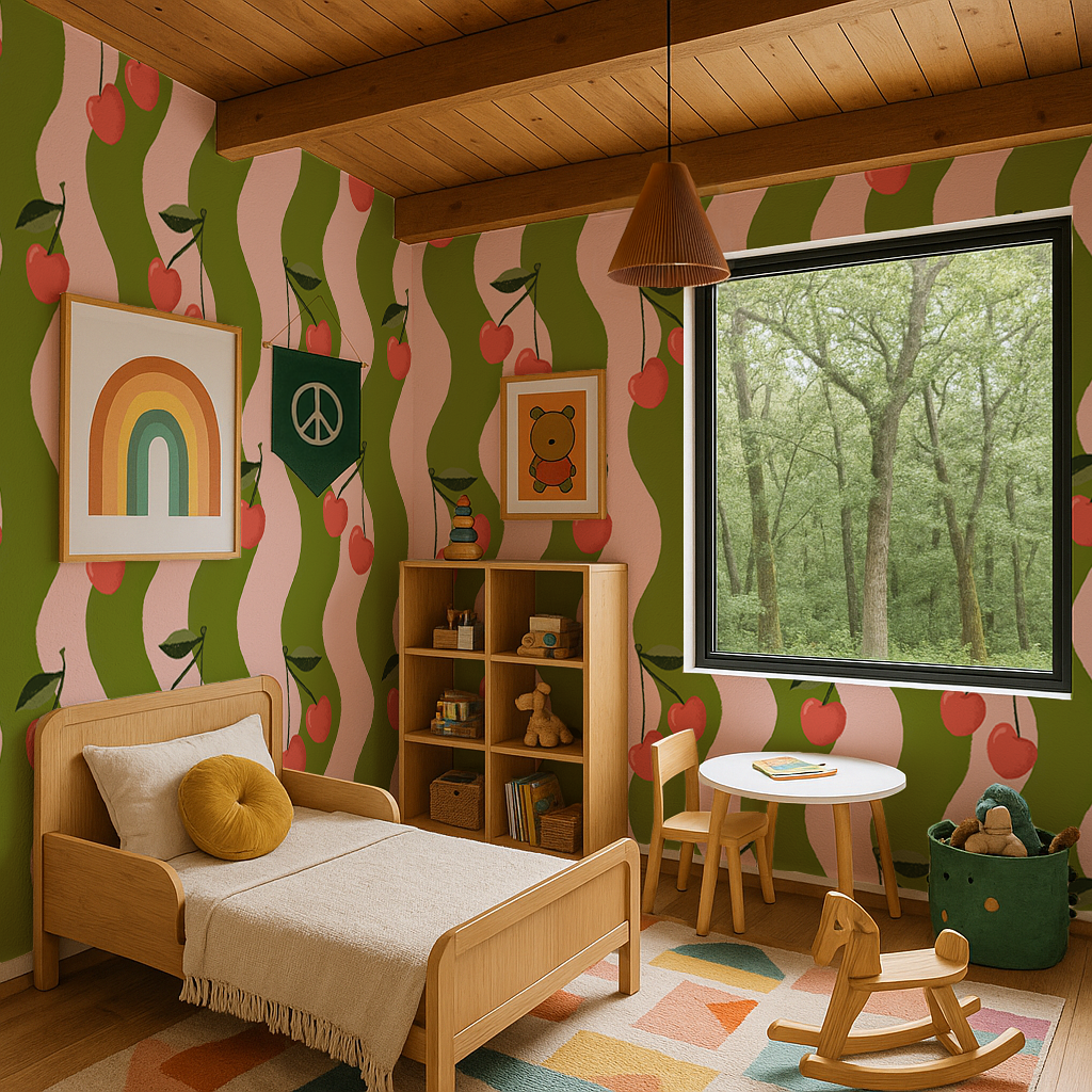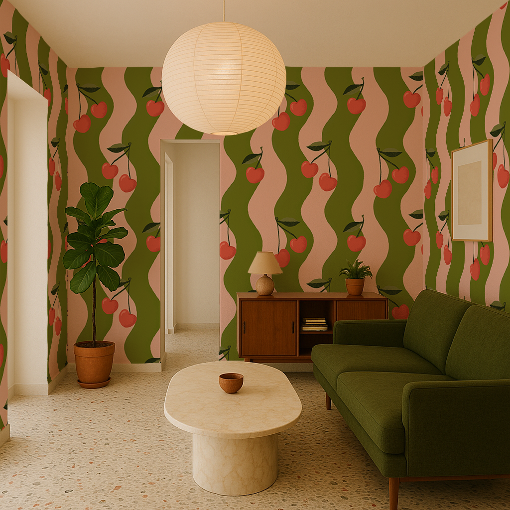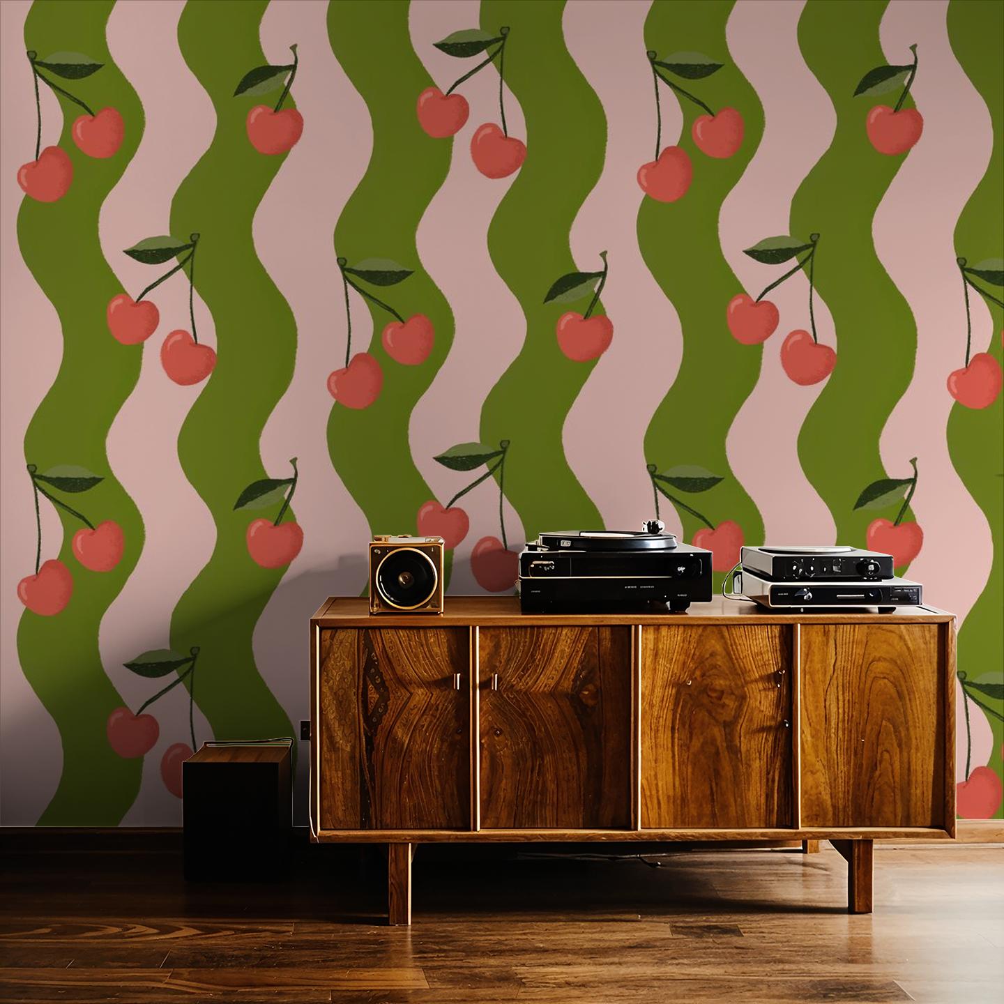 Make your space pop with Wavy Cherry wallpaper - a playful, fruity twist on traditional decor by Samantha Santana. Installation is a breeze with peel and stick or traditional pasted options, and it's even removable!