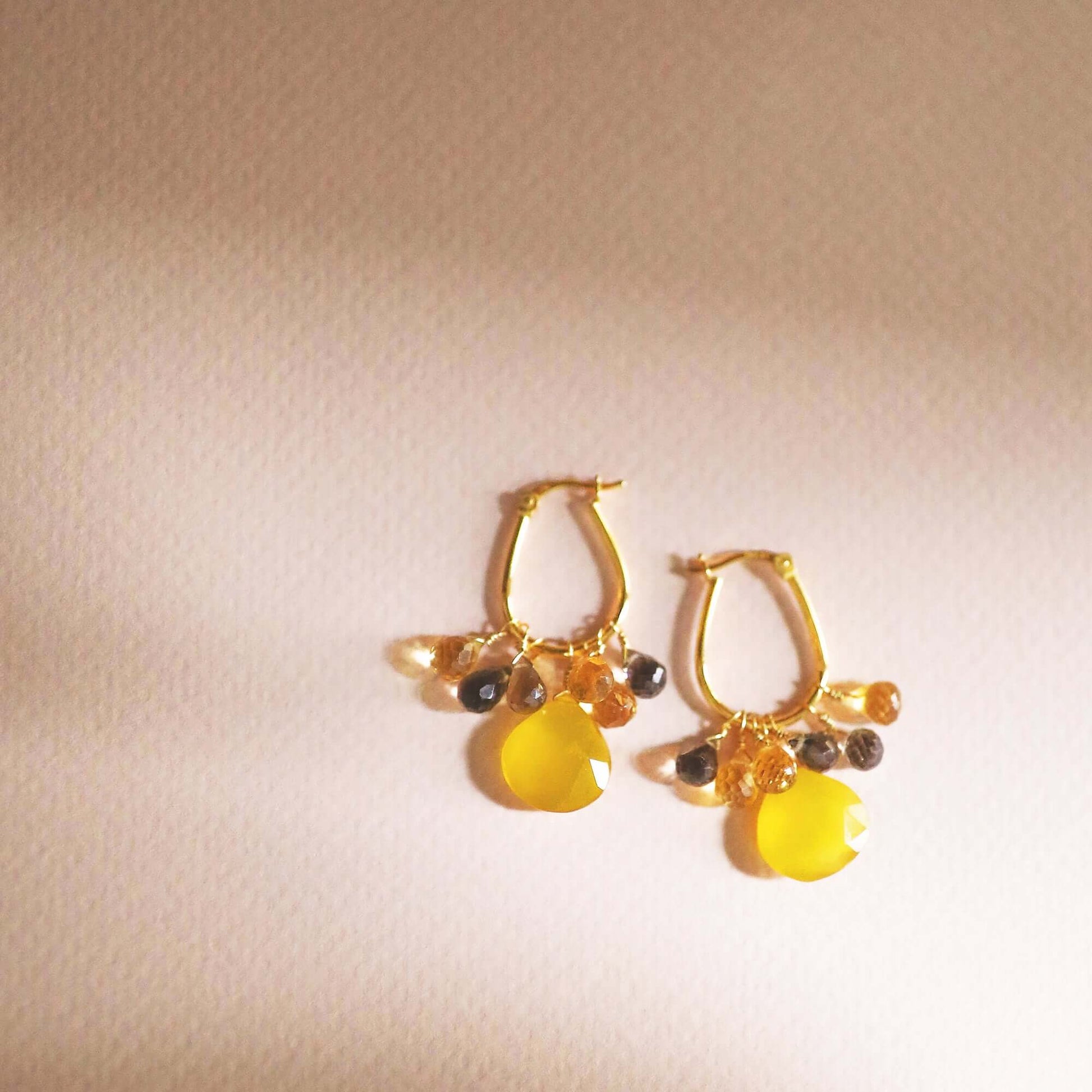 Gorgeous and unique gold earrings featuring yellow chalcedony gemstones paired with a mix of smoky quartz and champagne quartz gemstone briolettes.