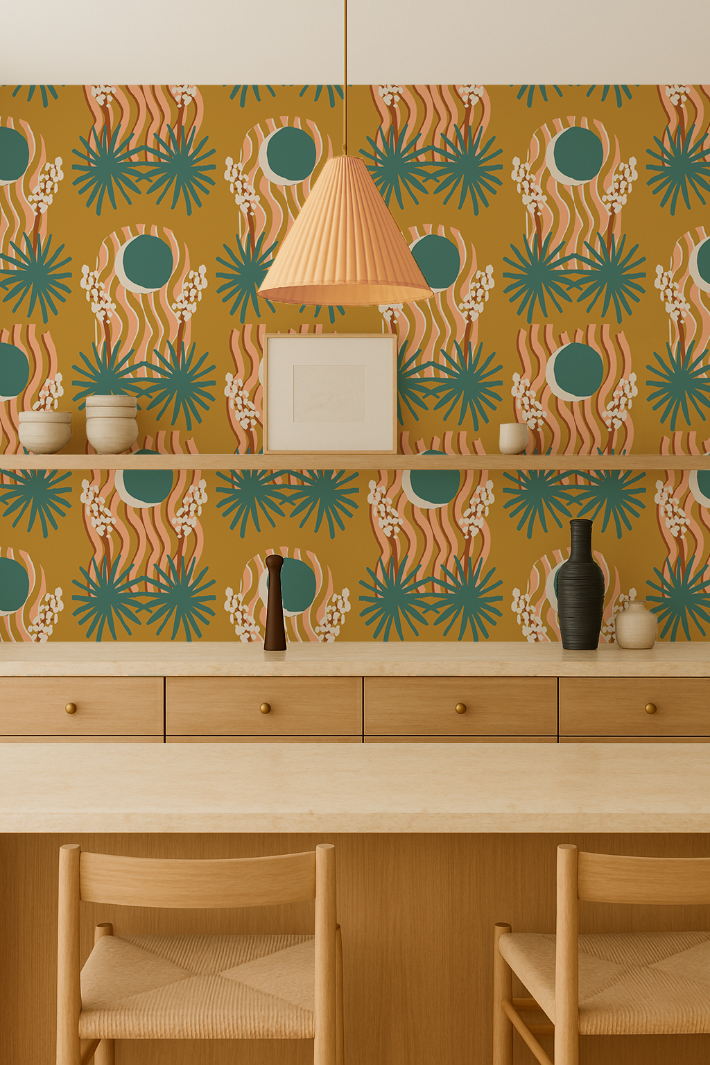 Experience the beauty of the California desert and palm springs modern, midcentury style with Yucca Moon Wallpaper. Designed by Samantha Santana, this artwork captures the essence of the desert landscape and brings it to life on your walls. With easy installation options including peel and stick vinyl and smooth traditional pasted, you can transform your space in no time. And the best part? It's completely removable! Upgrade your home decor and feel inspired every day with Yucca Moon Wallpaper!
